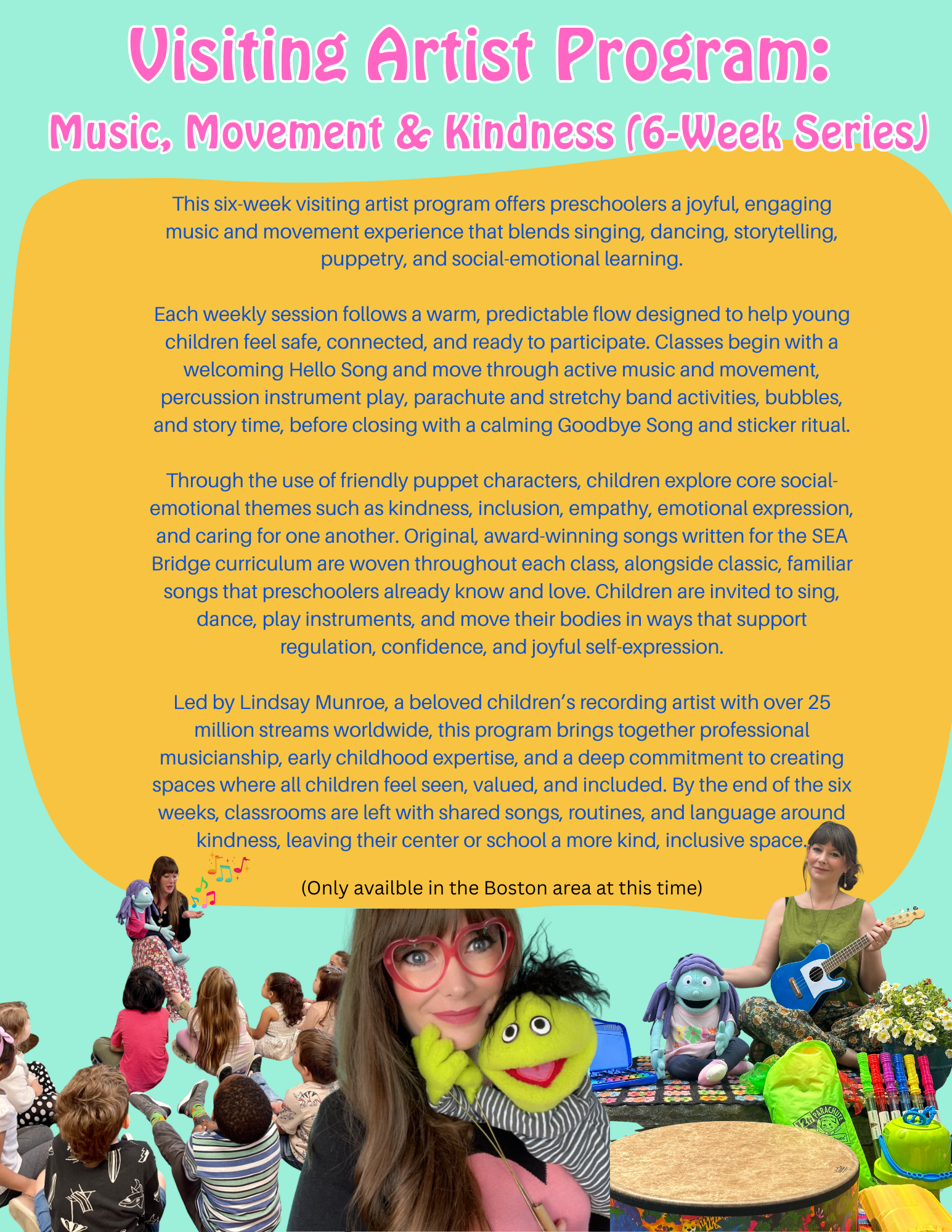 Led by Lindsay Munroe, a beloved children’s recording artist with over 25 million streams worldwide, this program brings together professional musicianship, early childhood expertise, and a deep commitment to creating spaces where all children feel seen, valued, and included. By the end of the six weeks, classrooms are left with shared songs, routines, and language around kindness, leaving their center or school a more kind, inclusive space.